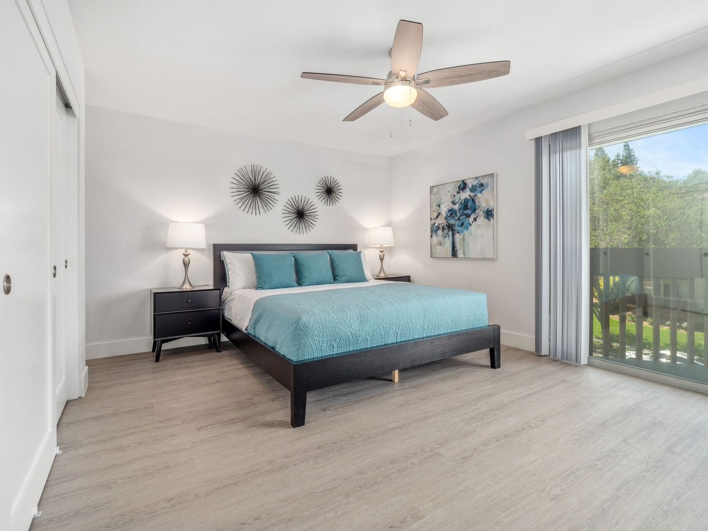 • Recessed dimmable lighting, ceiling fans, and mirrored closets